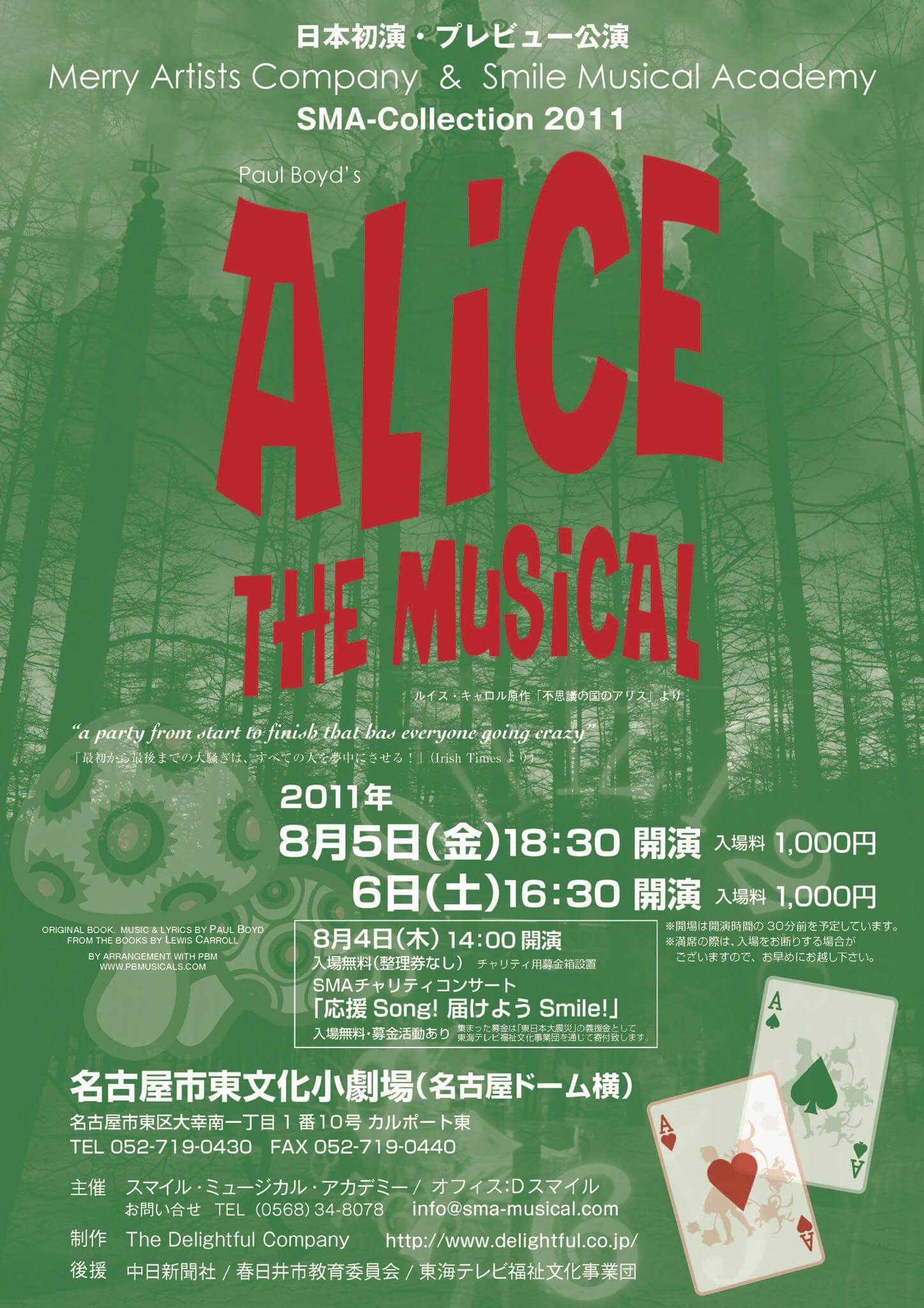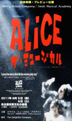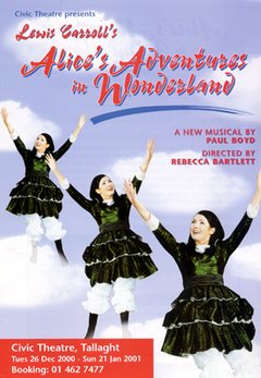 The show premiered in 1998 at Northern Ireland's national producing theatre, the Lyric Theatre Belfast, and the original production was nominated as Best Drama at the 1999 Belfast City Arts Awards. Since then Alice The Musical has been produced by theatres across Ireland, the UK, and in 2009 the show had its USA Premiere at the Actors’ Playhouse at The Miracle Theatre, Miami Fl, where it proved so successful that it was revived for a second time the same year, and again for another record-breaking revival in 2015. In 2011 Alice The Musical opened in a Japanese translation by Merry Artists Company at Nagoya City Higashi Playhouse, Japan.